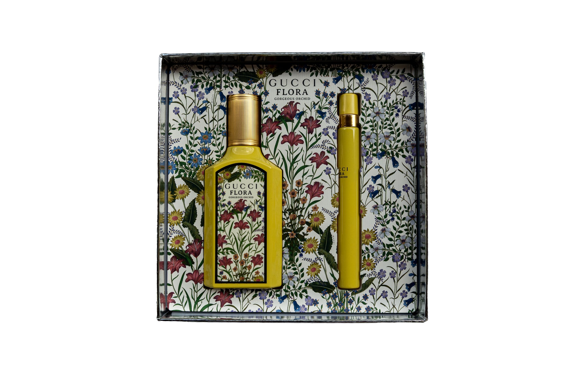 | Gucci Flora Gorgeous Orchid Eau de Parfum | 100ml | Full-size spray in a vibrant yellow bottle with signature Gucci floral print. |